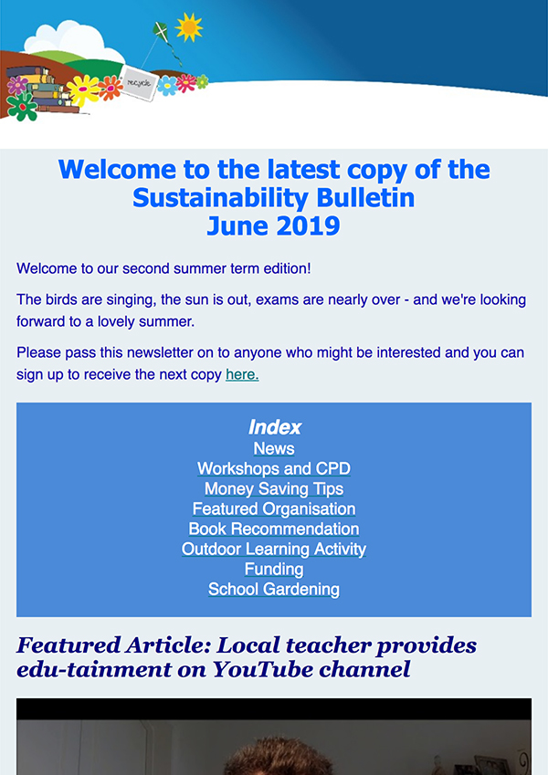 We send out a Devon Schools Sustainability Bulletin every half term. It includes information and opportunities relating to environmental education, school gardening, composting, funding, waste and recycling.